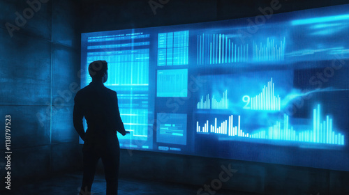 Businessperson Interacting with a Virtual Screen Displaying a Financial Bar Chart, Highlighting Percentage Growth, Improved Mortgage Returns, and Strategic Investments
