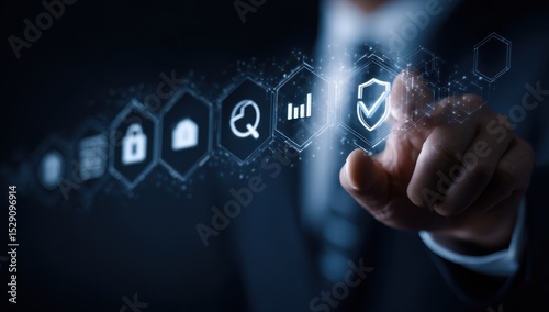 Businessperson interacts with digital security icons