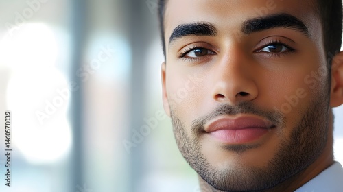 Businessperson's Face in an Office: Close-up of a businessperson’s face, confident and focused, set against an office backdrop.