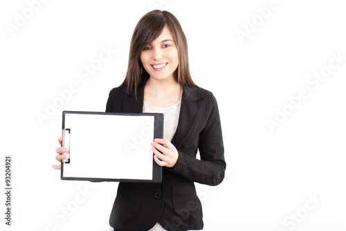 showing, blank, clipboard, business, marketing, businesswoman, holding, white background, cut-out, suit, missy, realtor, long hair, brown hair, high key, studio shot, brown eyes, lawyer, teacher, isolated on white, isolated, jacket, businessperson, people, instructor, prof, full-length, pant, color image, high heel, presentation, woman, smiling, standing, small business, white, confidence
