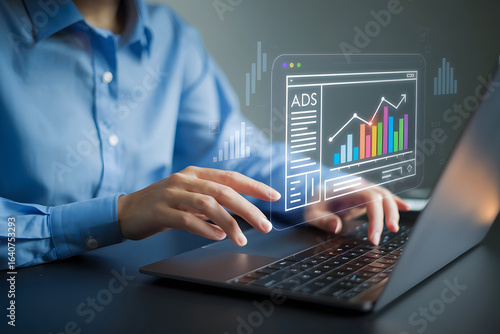 businesswoman, businesswoman, female, professional, marketing, dashboard, graph, chart, holographic, hologram, technology, laptop, computer, office, business, growth, success, strategy, productivity, management, modern, futuristic, night, entrepreneur, advertising, performance, engagement, conversion, overlay