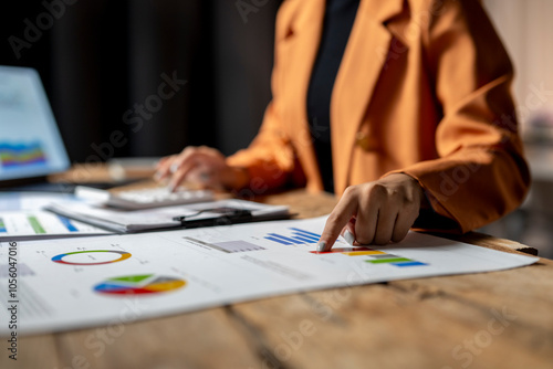 business, finance, analysis, businesswoman, office, desk, chart, graph, calculating machine, datum, financial, accounting, strategy, planning, investment, market, growth, profit, report, statistic, number, performance, corporate, executive, professional, entrepreneur, working, technology, laptop, paperwork, document, information, analysing, calculating, studying, concentrated, sharpened, hand, finger, pointing, success, achievement, teamwork, collaboration, brainstorming, modern, digital, wireless