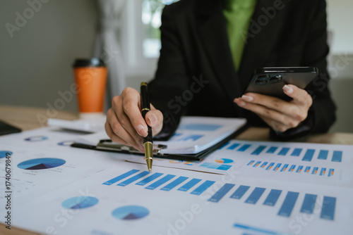 Businesswoman analyzing financial charts with calculator and documents on desk, working on business data and financial report in modern office.