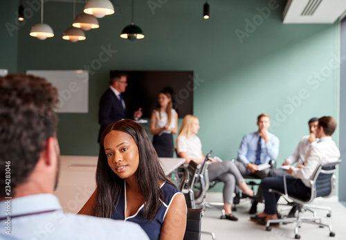 Businesswoman And Businessman Collaborating On Task Together At Graduate Recruitment Assessment Day