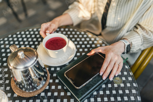 businesswoman, cafes, hot drink, break, smartphone, notepad, relaxation, professional, style, modern, woman, work, elegance, leisure, table, drink, technology, organised, calm, serene, interior, lifestyle, fashion, smart, watch, hand, cup, tea, hot, beverage, sitting, chair, sharpened, detail, casual attire, atmosphere, chic, daytime, urban, contemporary, accessory, desk, crop, anonymous, unrecognizable, from above