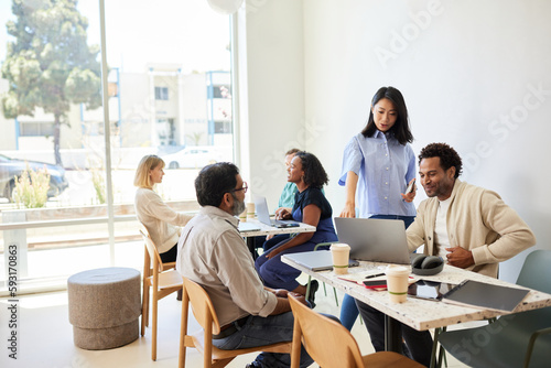 business, business meeting, businessman, businesswoman, cafes, chair, cafes, colleague, color image, communication, computer, consumerism, co-worker, client, day, discussion, entrepreneur, explaining, food and drink, horizontal, indoor, laptop, mature adult, new business, occupation, photo, planning, professional occupation, small business, strategy, table, teamwork, togetherness, wireless technology, working, los angeles, california, us, 30s, 50s, baby boomer, male, female, multiracial, asian, white, indian