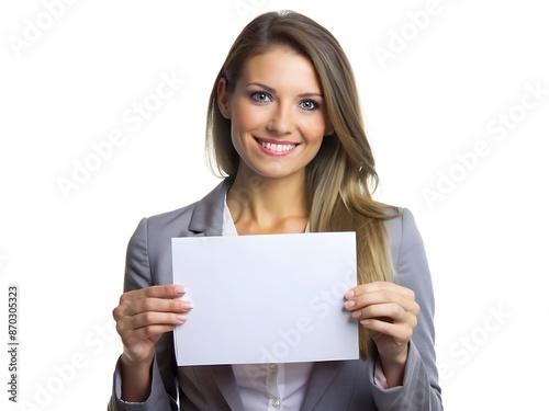 business, businesswoman, professional, woman, female, blank, signs, card, paper, white, isolated, portrait, smiling, happy, confident, success, opportunity, message, advertisement, marketing, communication, presentation, corporate, office, work, employee, executive, manager, leadership, entrepreneur, startup, job, career, grey, suit, jacket
