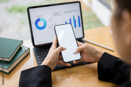 Businesswoman holding smart phone with blank copy space screen for your text message or your content