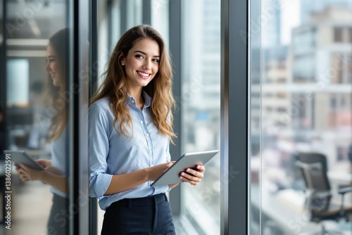 businesswoman, tablet, office, smiling, confident, professional, modern, success, technology, window, workplace, urban, corporate, female, entrepreneur, casual attire, leadership, city landscape, startup, attractive, manager, digital, communication, elegant, stylish, lifestyle, sharpened, indoor, light, contemporary, planning, vision, future, connection, productivity, career, smart, business, happy, executive, workspace, innovation, casual clothes, expression, men at work, ambition, ai, generative, illustration