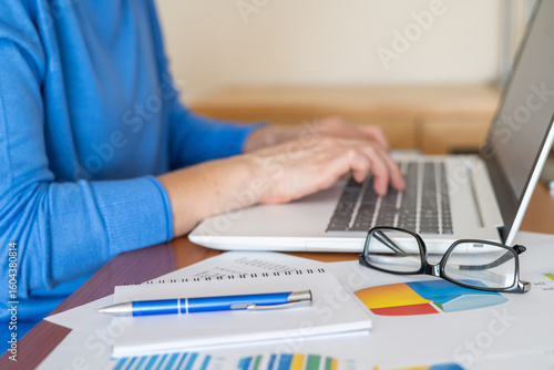 Businesswoman is typing on a laptop with financial charts, notepad and pen on a wooden desk, creating a productive and focused work environment for investment strategy and financial planning