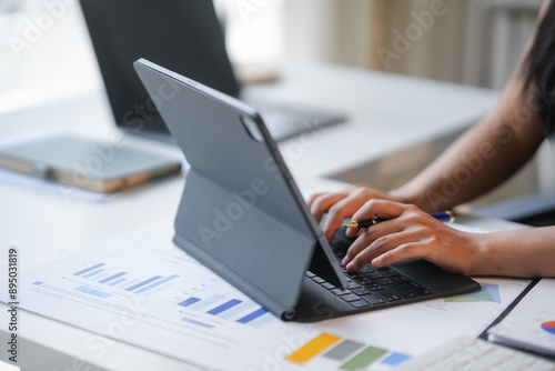 business, woman, office, tablet, computer, datum, analysis, finance, chart, graph, working, technology, digital, marketing, strategy, planning, businesswoman, professional, desk, workplace, corporate, cyberspace, online, connection, communication, research, report, document, information, growth, success, startup, entrepreneur, modern, bright, clean, workspace, keyboard, typing, hand, pen, close, up, indoor, daytime, female