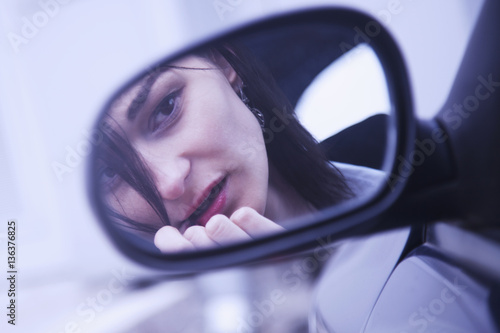 business, transportation, vehicle, car, female, automobile, auto, person, mirror, adult, 1, concept, driver, woman, side, reflections, caucasian, rent, transport, drive, owner, young, outdoors, travel, horizontal, conceptual, businesswoman, businessperson, colours, happy, hand, serious, dealer, head, expensive, eye, consumer