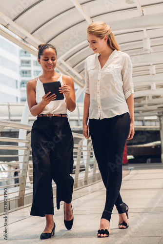 Businesswoman Showing Digital Tablet To Female Colleague On Walkway Bridge In City