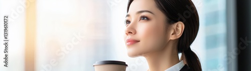 Businesswoman Sipping Coffee While Looking Forward in a Bright Modern Office Space