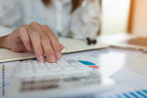 Businesswoman using calculator blurred background.Savings, finances, and economy concept through a laptop.