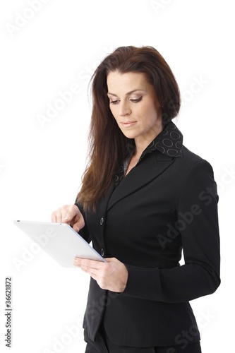 using, businesswoman, tablet, computer, touch screen, isolated, white, smart, smiling, face, business, pointing, caucasian, suit, people, lifestyle, 40s, cut-out, woman, indoor, female, working, portrait, 30s, attractive, smile, alone, good, mood, standing, mid, adult, businessperson, attention, finger, work, hand, photo, 1, only, year, directing, background, vertical, well, dressed, 1, single