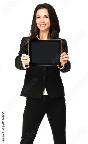 woman, businesswoman, showing, white background, isolated, isolated on white, business, color image, brown eyes, brown hair, businessperson, business suit, caucasian, confident, cut-out, displaying, electronic device, electronic, female, happy, high key, holding, jacket, long hair, mobile, mobile device, pant, person, presenting, smiling, standing, studio shot, computer, tablet, vertical, white, missy