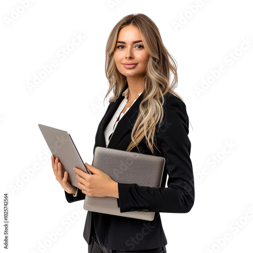 woman, businesswoman, business, laptop, computer, people, standing, person, beauty, holding, smiling, technology, smile, professional, work, office, notebook, folder, secretary, manager, lady, businesswoman, student, suit, tablet