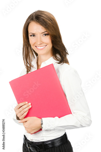 Businesswoman with red folder, isolated