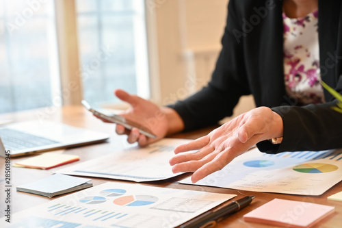 Businesswoman working with analysis finance document paper.
