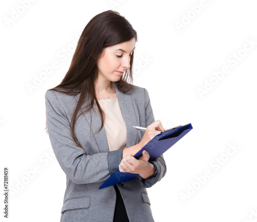 woman, lady, girl, female, caucasian, european, brunette, brunet, latin, business, businesswoman, dress, executive, teacher, assistant, profession, leader, manager, blazer, jacket, clipboard, note, file, pad, folder, write, pen, jot, down, record, isolated, white, background, people, person, portrait, 1, cut-out, studio, middle, age, mature, senior, grey, beautiful, pretty, smile, happy