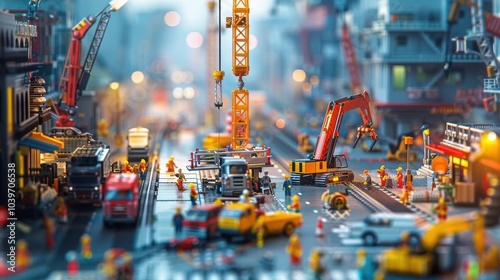 Busy construction site with cranes, trucks, and workers in a city setting, blurred background, vibrant colors.