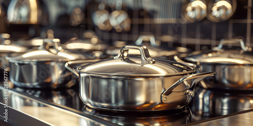 Busy Kitchen With Pots and Pans Cooking on the Stove Black, Pot on the stove Stainless pan on the hob.