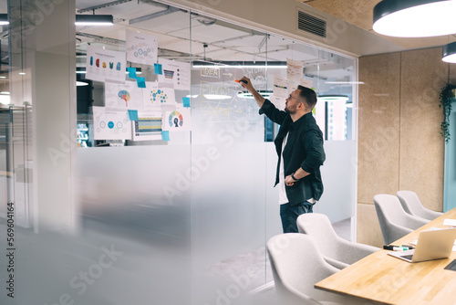Busy male entrepreneur drawing scheme with marker on glass wall