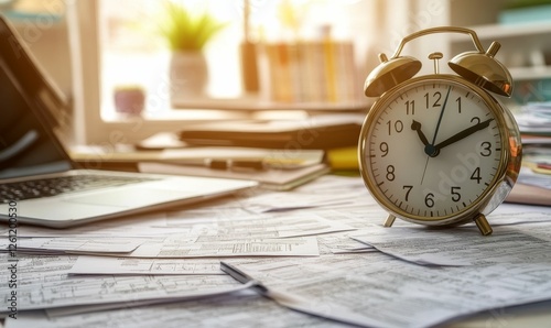 paperwork, document, desk, office, clock, alarmclock, time, deadline, pressure, urgency, gold, gold, white, tied-up, work, laptop, computer, paper, file, sunlight, light, sunlit, morning, afternoon, workday, business, indoor, home office, room, interior