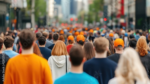 Busy Urban Street Filled with Diverse Crowd Wearing Orange Caps