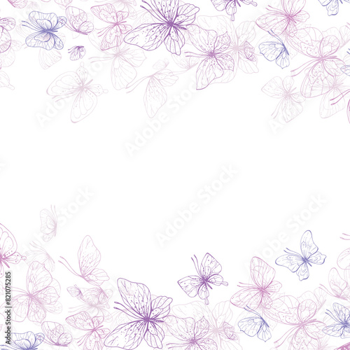 Butterflies are pink, blue, lilac, flying, delicate line art. Graphic illustration hand drawn in pink, lilac ink. Square frame, template EPS vector