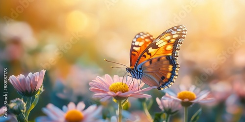 Butterfly on Bloom, delicate butterfly resting on vibrant flower, soft garden hues create a serene and enchanting atmosphere