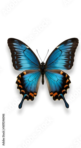 butterfly on white background, Very beautiful blue yellow orange butterfly in flight isolated on a white background.