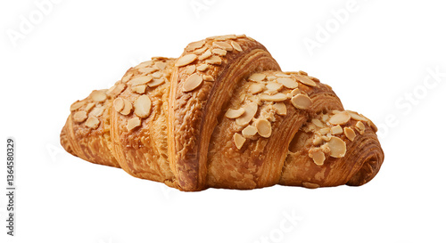 Buttery almond croissant with crispy layers and golden-brown crust, topped with sliced almonds, isolated on white background, gourmet French pastry, flaky and rich baked good, perfect for breakfast or