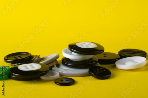 accessory, circle, detail, clothing, round, stitch, design, buttons, yellow, dress, background, orange, clothes, texture, pattern, craft, colours, fashion, various, closeup, plastic, thread, collection, textile, black, old
