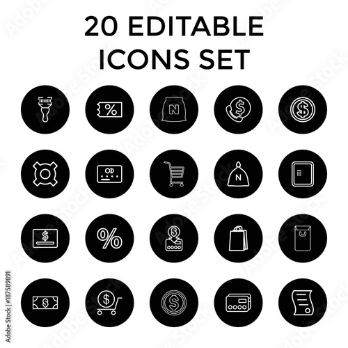buy, icon, sack, atm, credit, card, dollar, shopping, bag, money, put, on, ticket, sale, bank, support, bar, code, scanner, percent, bill, of, house, sell, coin, cart, outline, set, vector, symbol, isolated, illustration, signs, business, design, cash