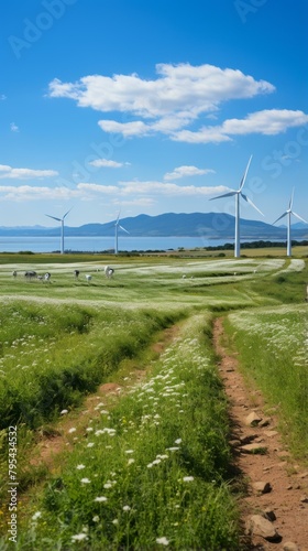 b'Wind turbines in a green field with a mountain range in the distance'
