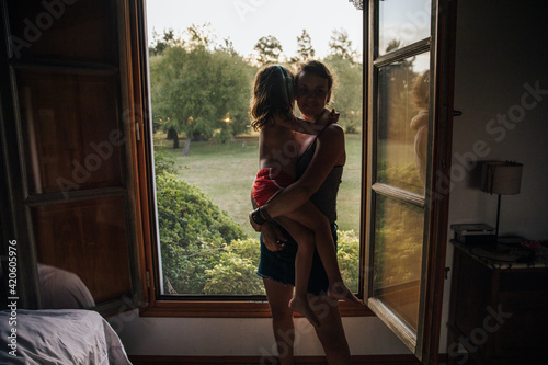 affection, beautiful, daughter, family, hug, human face, indoor, interior, children, mother, portrait, room, window