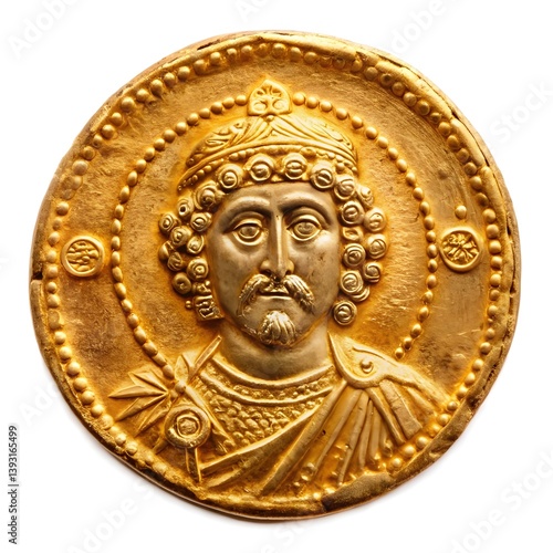 gold, coin, medallion, portrait, emperor, byzantine, empire, ancient, historical, artifact, relic, metal, circular, crown, beard, jewellery, ornate, detail, texture, macro, closeup, embossed, relief, head, face, monarch, sovereign, dynasty, history, culture, religion, iconography, numismatic, antique, treasure, wealth, precious, metalwork, craftsmanship, artistry
