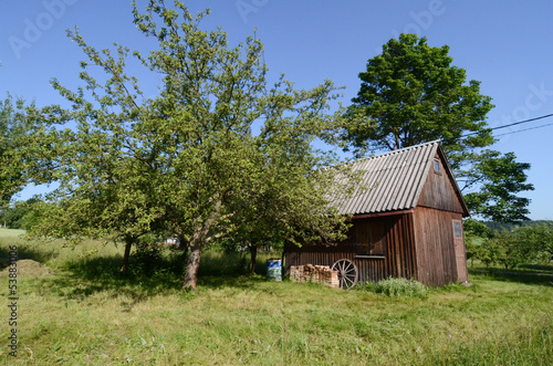 cabin, bungalow, house, wood, wooden, door, roof, simple, countryside, architecture, czech republic, small, tree, tree, meadow, nature