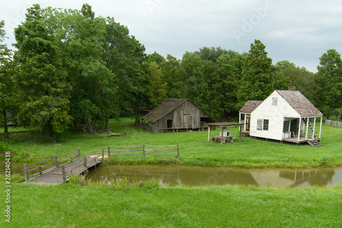 Cabin and barn at LSU Rural Life Museum, an outdoor museum of Louisiana history, Baton Rouge, Louisiana.