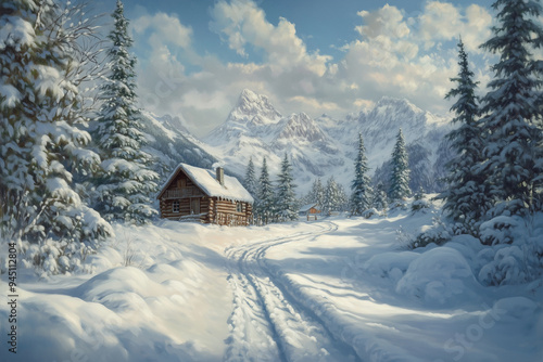 cabin in the woods with snow on the ground. The cabin is surrounded by trees and the sky is blue. The scene is peaceful and serene