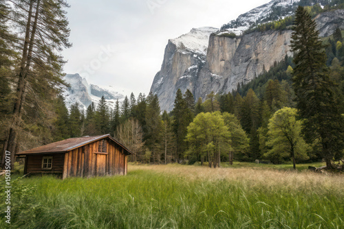 Cabin in yosemite national park scenic landscape with mountains trees and meadow for travel and tourism
