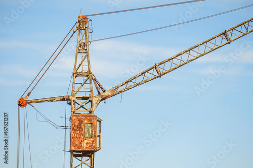 Cabin of old abandoned rusty tower crane on a blue sky background
