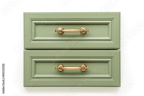 Cabinet door samples in market in a row. Green Kitchen wooden cabinet door, brass door handles, furniture isolated on white. Chic look in the room. Trendy interior units. Home improvement concept.