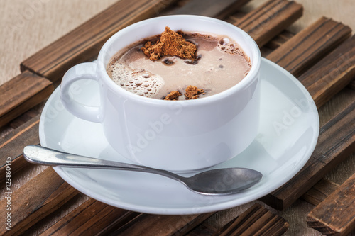 beverage, cocoa, hot drink, cup, drink, hot, of, on, plate, powder, spoon, table, texture, water, white, wood