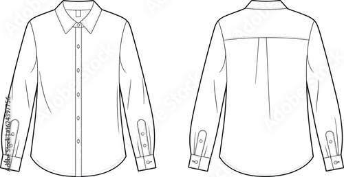 Cad drawing flat vector illustration of classic women’s button-up shirt, long sleeves, front and back view, collar, cuffs