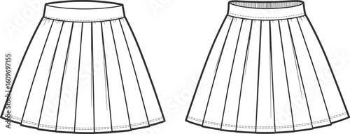 Cad drawing flat vector illustration of pleated skirts, technical fashion sketch, apparel template, line art design, front view, minimal