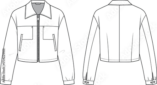 CAD drawing flat vector illustration of stylish cropped zipper jacket with front patch pockets, long sleeves, technical fashion template design