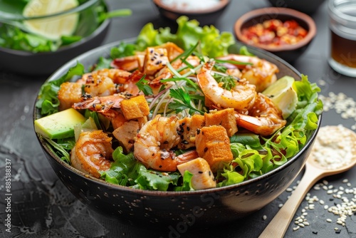 Caesar Salad with Shrimps, Chicken, in Metal Bowler with Sesame Seeds on Dark Stone Background